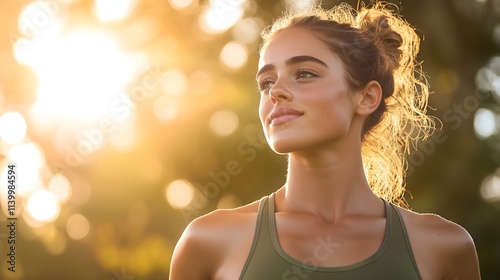 Caucasian woman in olive tank top at sunset, horizontal, ideal for fitness motivation, wellness content, outdoor lifestyle and natural beauty presentations
