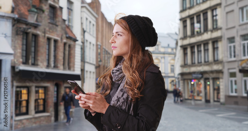 Caucasian woman lost in Bruges Belgium texting friend on mobile phone