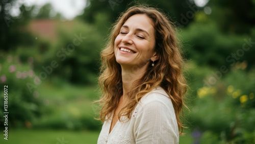 Caucasian woman smiling in outdoor garden, surrounded by greenery and flowers, exuding joy and well being, emphasizing positivity