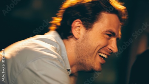 male, caucasian, young, laughing, profile, smile, happiness, joy, side, view, warm, light, casual attire, portrait, brown, hair, candid, expressive, cheerful, emotion, relaxed, person, beard, stubble field, chin, ear, teeth, nose, friendly, lively, exuberant, animated, genuine, engaging, warmth, mood, illuminated, moment, laughter, grin, upbeat, spirited