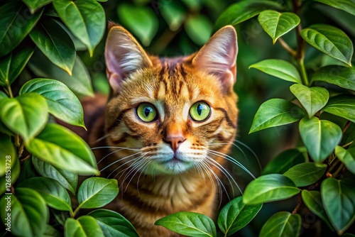 cat, green leaf, foliage, closeup, animal, pet, wildlife, nature, cautious, alert, hidden, secret, mystery, camouflage, leaf, tree, forest, summer, spring, image, picture, photograph, felino, mammal, furry, adorable, cute, playful, wild, domestic, animal portrait, eye, whisker, fur, paw