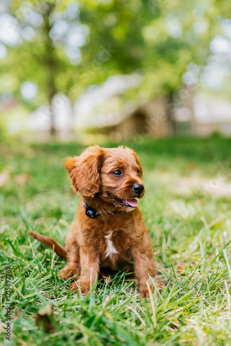 puppy, dog, red, brown, fluffy, cute, adorable, pet, animal, outdoors, sitting, grass, nature, happy, small dog, playful, sweet, furry, canino, friendly, relaxing, companion, spring, summer, cosy, innocent, curious, cheerful, portrait, vibrant, sunlit, natural light, purebred, mixed breed, cuddly