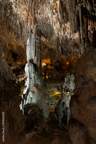Cave wall with light, interior of the beautiful cave, abstract background and texture, stalactites and stalagmites, underground, natural water shaped walls
