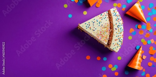 party, cake, celebration, confetti, birthday, dessert, sweet, hat, fun, festive, colours, decoration, anniversary, bakery, event, happiness, surprise, greeting, holiday, invitation, confectionery, delicious, frosted, slice, vibrant, bright, purple, background, sugar, pastry, sprinkle, baked, tabletop, treat, sweet, nobody, carnival, enjoyment, cheerful, decorative, colourful, deliciously, occasion, paper, isolated, topview, creative, artistic