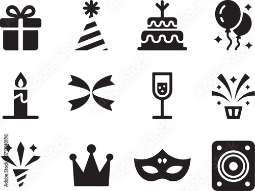 celebration, party, gift, cake, balloon, hat, candle, ribbon, champaign, confetti, crown, mask, speaker, festive, joy, fun, event, holiday, birthday, anniversary, wedding, special, occasion, gathering, cheer, music, dance, decoration, surprise, happiness, excitement, vibrant, modern, icon, symbol, design, clip art, graphic