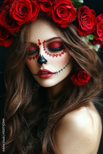 Celebrating Day of the Dead, a woman is dressed in traditional attire with elaborate skull face paint and a striking crown of red roses, symbolizing remembrance and joy