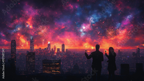 new year, party, celebration, fireworks, champaign, city, silhouette, clock, countdown, festivity, night, sheen, glasses, toast, decoration, festive, light, heaven, midnight, celebrate, evening, urban, glamour, luck, happy