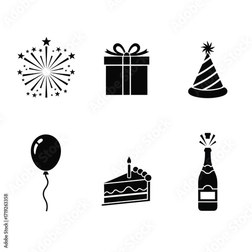 celebration, party, icon, fireworks, gift, present, party hat, balloon, cake, birthday, champaign, bottle, festival, event, holiday, graphic, design, symbol, clip art, illustration, vector, black, white, simple, silhouette, set, collection, element