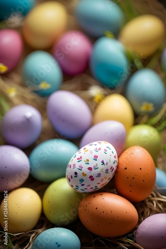 Celebration of spring with colorful Easter eggs nestled in soft straw, symbolizing joy and family gatherings during the festive holiday season. Generative AI