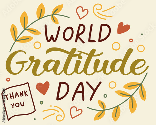 Celebratory World Gratitude Day Illustration with Hearts Leaves and a Thank You Note Design