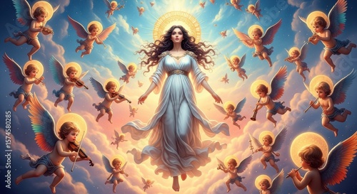 Celestial Ascension of Divine Feminine Amidst Heavenly Choir of Angels