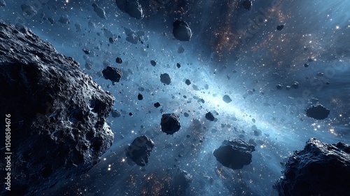 Celestial Asteroid Field: A mesmerizing view of rocky debris in a vast, star-studded cosmic expanse, evoking the mystery and beauty of interstellar space.