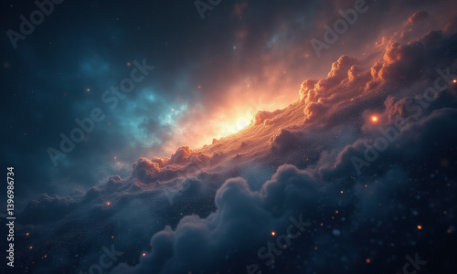 space, cloud, cosmic, sunrise, nebula, galaxy, star, astronomy, night, sky, dark, light, orange, blue, purple, fantasy, science fiction, artwork, digital artwork, illustration, background, texture, wallpaper, abstract, aethereal, mystical, dreamlike, magical, vibrant, colourful, dramatic, atmospheric, majestic, serene, peaceful, immensity, forever, universe, celestial, landscape, horizon, energy, power, glow, shining, glittering, dust, particle