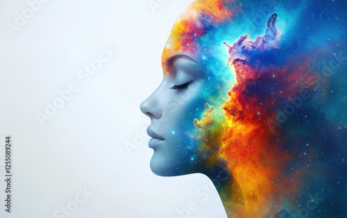 cosmic, portrait, mindfulness, imagination, dream, celestial, wonder, thought, mystical, grace, visual, spirituality, spectrum, aethereal, mystery, serenity, profile, universe, surreal, harmony, vision, meditation, inspiration, innovation, exploration, form, perspective, vibrant, fantasy, artwork, creativity, emotion, journey, heavenly, elegance, life events, atmospheric, perception, mythical, consciousness, depiction, illustration, female, reality, concept, design, style, colourful, closeup