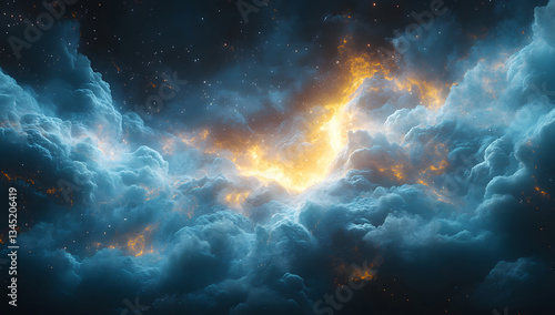 nebula, space, cosmos, artwork, digital artwork, fantasy, fire, ice, cloud, celestial, dramatic, fiery, icy, cosmic, star, night sky, glowing, abstract, texture, background, wallpaper, design, art, illustration, vibrant, energy, power, light, dark, blue, orange, yellow, contrast, mystical, magical, aethereal, surreal, dreamlike, atmosphere, mood, scene, visual, graphic, image