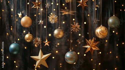 Celestial holiday arrangement, golden astronomical theme decorations, sparkling star cutouts and spheres, premium Christmas ornaments, hanging display, detailed metallic texture, illuminated festive