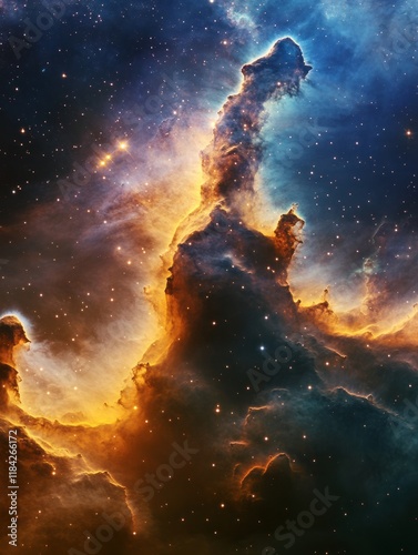 nebula, cosmic, cloudscape, star, stellar, formation, space, galaxy, universe, astronomy, astrophysics, celestial, light, dust, gas, colours, orange, yellow, blue, dark, night, sky, background, pattern, texture, abstract, art, image, photo, photo, science, wonder, beauty, majestic, huge, infinite, mysterious, awe, inspiring, vibrant, dramatic, powerful, spectacle, deep, immensity