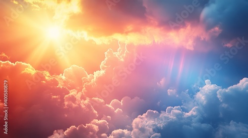 Celestial sunrise with vibrant hues, luminous clouds, and ethereal sunbeams