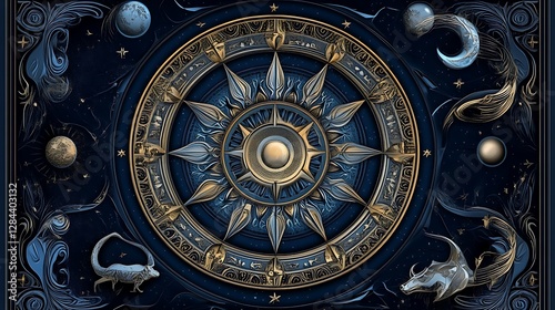 Celestial Wheel: A Digital Painting of Zodiac Constellations and Lunar Phases AI Generated