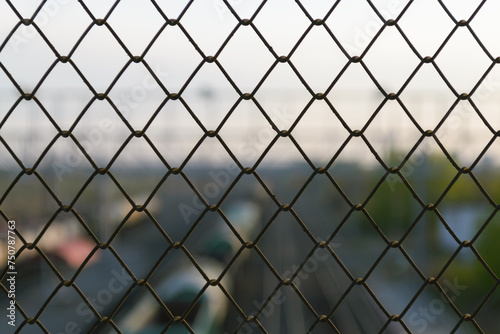 Cells of a wire fence in the evening against the background of a railway in a blur