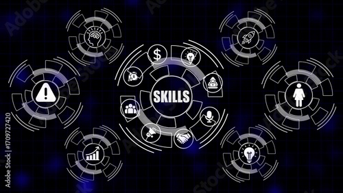 Central word S K I L S surrounded by white icons in circular gears on dark blue background skills learning