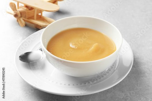 Ceramic bowl with baby food on grey background