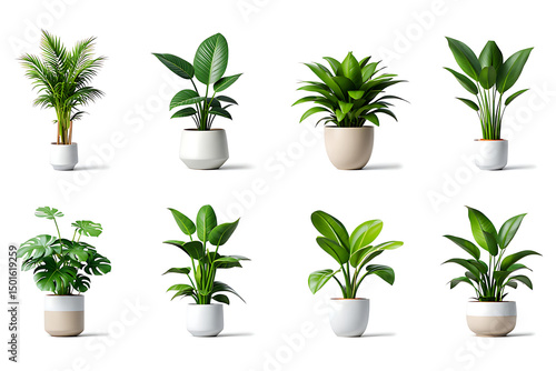 ceramic planters, various indoor plants, potted houseplants, succulents, ferns, tropical foliage, minimalist plant decor, natural lighting, white background, ceramic pot, green leaves, plant arrangeme