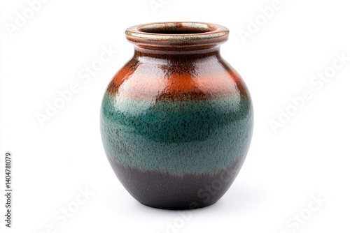 vase, ceramic, pottery, glaze, craft, hand-made, earthenware, terracotta, brown, orange, green, isolated, white background, studio shot, decorative, art, design, object, still life, domestic, rustic, vintage, indoor, simple, minimal, shadow, smooth, round, tabletop, display, empty, decoration, centrepiece, artwork, ornament