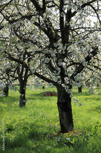 cherry tree, fruit farm, pollination, spring, good weather, greengrass