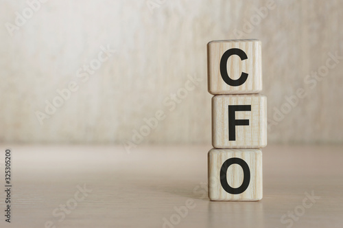 CFO Chief Financial Officer written on a wooden cube in front of a laptop