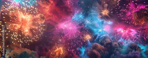 Chain reaction of fireworks exploding in a vibrant display, 4K hyperrealistic photo