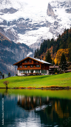 Chalet near a lake, A lake house between the trees in breathtaking nature. The house in the greenery near the lake. Reflected on water. Country side, forest and lake with house.