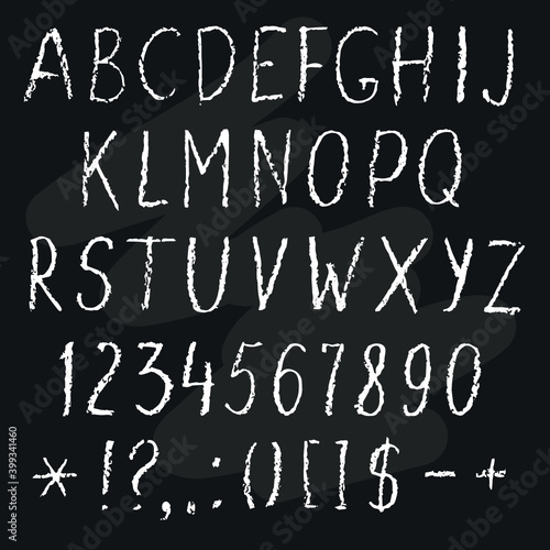 Chalk vector alphabet. Latin letters and numbers in chalk. English alphabet for menu design.