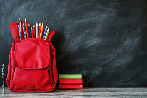 Chalkboard Red Backpack Pencils and Stationery on Classroom in Interior of Elementary School
