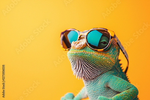 chameleon, sunglasses, reptile, cool, stylish, animal, fashion, solid, background, colourful, fun, trendy, quirky, exotic, nature, wildlife, tropical, humorous, vibrant, unique, eye-catching, pose, charismatic, artistic, creative, personality, confident, playful, funky, generative, ai