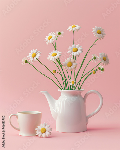Chamomile bouquet in teapot and tea mug on a light pink background. Product photo. Minimal flower composition