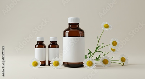 Chamomile Matricaria Chamomilla Derivative Products Mockup Featuring Amber Bottles and Fresh White Flowers Against Cream Background
