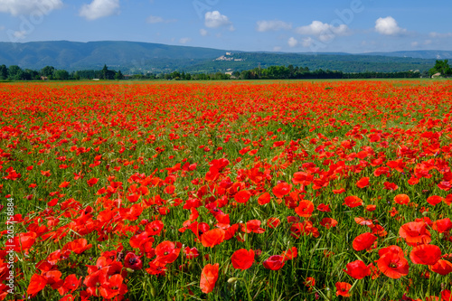 Champ de coquelicots en Provence. Massif du Luberon et Village de Lacoste en arrière plan. France.