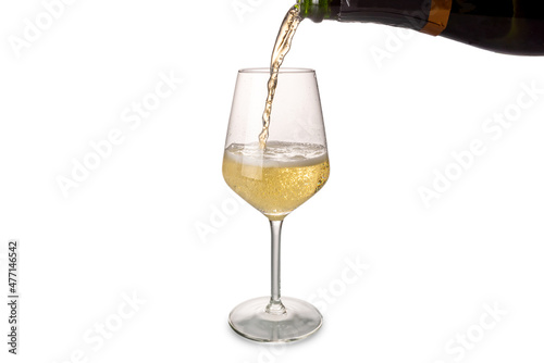 Champagne or sparkling wine pouring into glass from bottle with splashing, isolated on white, copy space