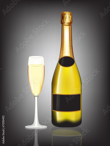 Champagne yellow bottle and champagne glass on black
