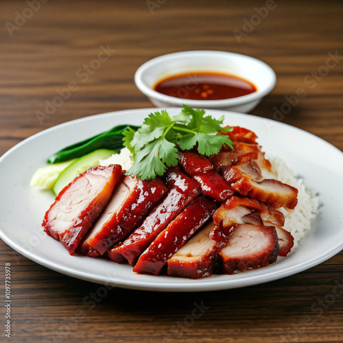 chinese food, asian cuisine, pork meat, rice, roasted, bar-b-q, grilled, meat, dish, meal, cookery, culinary, delicious, tasty, epicure, eatery, food photography, closeup, plate, table, wood, cilantro, coriander, sauce, sweet, sour, tradition, culture, lunch, dinner