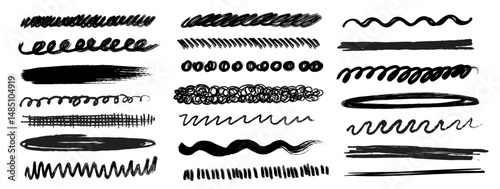 Charcoal and crayon pencil stroke vector collection. Horizontal hand-drawn lines, thin and bold textures. Grunge scribbles, chalk brush marks, pastel smears, pencil dividers. Rough textured underlines