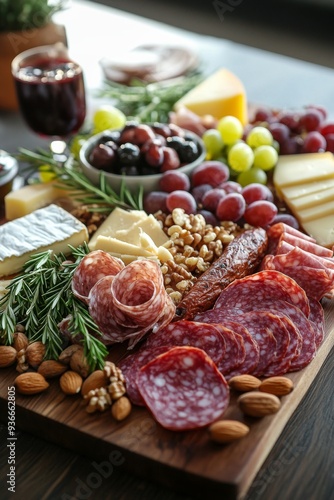 charcuterie, board, meat, cheese, nut, cracker, salami, prosciutto, gouda, cheddar, blue, cheese, almond, pecan, thyme, platter, snack, gathering, party, entertaining, epicure, food, rustic, wooden, presentation, deli, culinary, ingredient, cookery, hospitality, tasting, savoury, fresh, sharing, casual attire, dining, grilled, smoked, selection, hand-made, picnic, styling