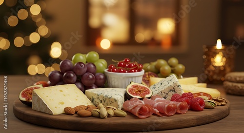 Charcuterie board with gourmet cheeses, cured meats, fruits and nuts, festive background