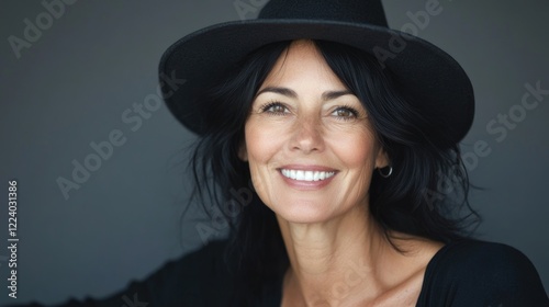 woman, charming, elegant, mature, smiling, joyfully, stylish, black, hair, hat, feminine, neutral, background, portrait, beauty, fashion, cheerful, confidence, grace, friendly, happy, attractiveness, expression, headwear, accessory, age, individual, lifestyle, facial, feature, gaze, personality, sophisticated, trendy, model, bright, warm, serene, content, poised, perspective, celebration, femininity, allure, radiant, character