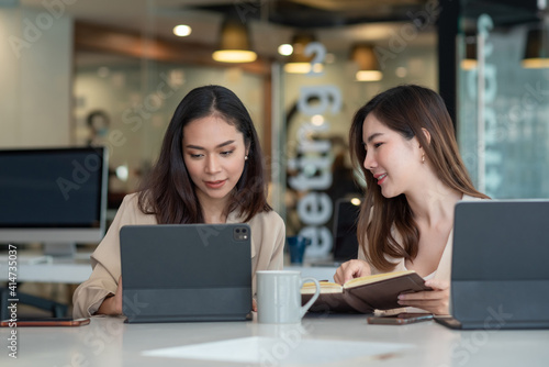Charming Asian businesswoman working together using a tablet and taking notes at the office.