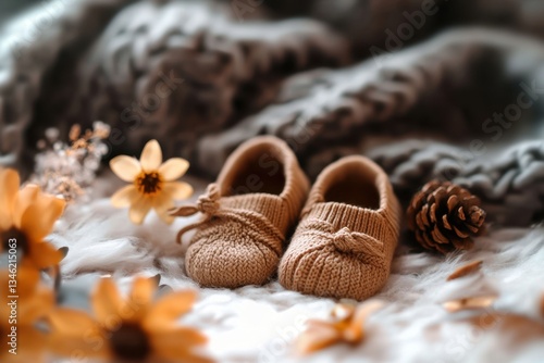 Charming baby shower details closeup of adorable tiny booties on a soft blanket surrounded by flowers and nature elements captured in a warm cozy setting