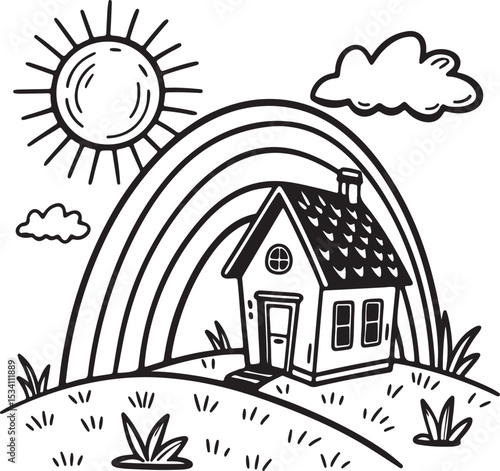 Charming Black and White House Under a Rainbow A Delightful Coloring Page Illustration