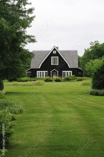 Charming black house surrounded by lush greenery with a manicured lawn and trees on an overcast day in a serene rural setting