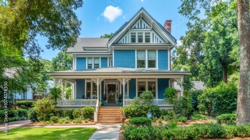 house, architecture, victorian, blue, garden, tree, porch, step, window, roof, design, exterior, landscaping, property, home, residential, style, facades, entrance, greenery, sunlight, peaceful, inviting, neighbourhood, traditional, structure, beauty, detail, symmetry, environment, space, charme, heritage, character, classic, vintage, tranquil, aesthetic, scene, nature, community, suppressing, attracted, yard, flower, driveway, pathway, rural